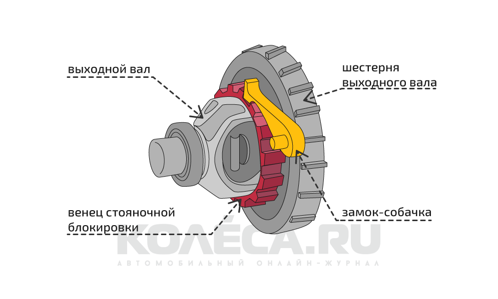 Впрочем, давайте вспомним, что собой представляет механизм «паркинга» на автоматических коробках передач. Основными его элементами являются крупнозубая шестерня и коромысло (также называемое мастерами «собачка», «крючок» и т. п.), на котором имеется шип, входящий между зубьями шестерни и не дающий ей вращаться.