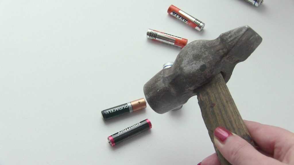 - использовать молоток, столовую ложку или другой тяжелый предмет (можно не бояться разбить батарейку);