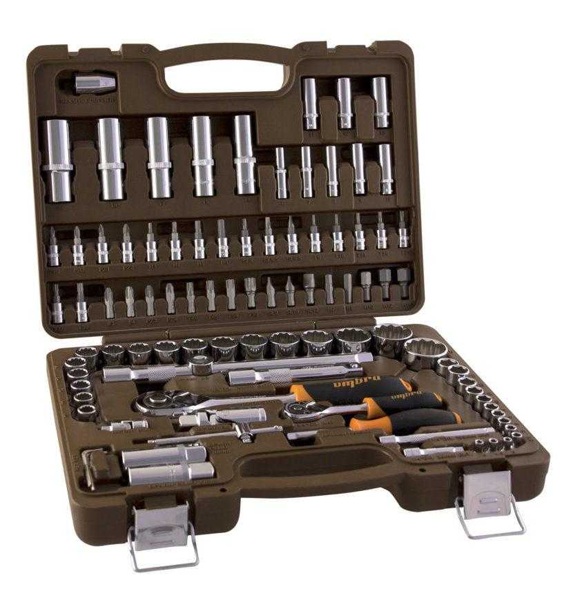 Универсальный набор в компактном чемодане. В него входит 101 предмет: 28 торцевых головок от 4 до 32 мм под ½ и ¼ дюйма, 10 совмещённых гаечных ключей от 8 до 19 миллиметров, 31 бита под стандартный квадрат ¼ дюйма, шесть отвёрток, 3 единицы шарнирно-губчатого инструмента и несколько дополнительных элементов. Рукоятки у каждого инструмента прорезинены, в руках сидят удобно. Так же пользователи отмечают надёжность самого чемодана и застёжки.