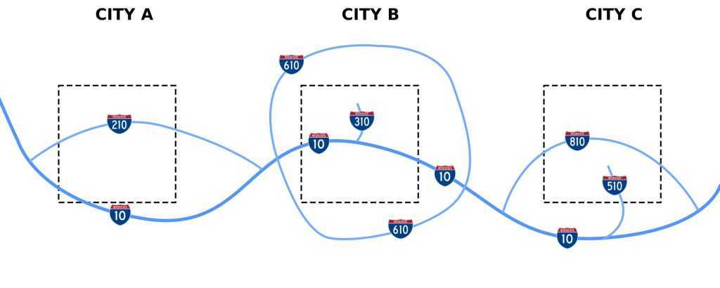 Когда объездные кольцевые трассы достигают населенные пункты, они условно обозначаются номером маршрута и четным префиксом. Например, I-320 – это кольцевая на шоссе I-20, I-350 – на I-50. Если трасса будет пролегать через три города, то нумерация такая – номера I-250, I-450 и I-650. В других штатах нумерация начинается заново и дорог под номером I-250 может быть несколько по всем штатам.