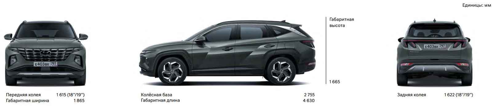 Для продажи в России Hyundai Tucson в новом кузове поставляется в длиннобазной версии (с колесной базой 2755 мм), его основные габариты: