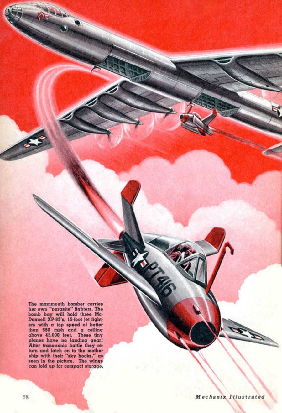 Но зачем заставлять истребители лететь следом, если можно взять их с собой на борт? В данном случае шестимоторный бомбардировщик вмещает во внутренних ангарах сразу три истребителя Donnell XP-85.