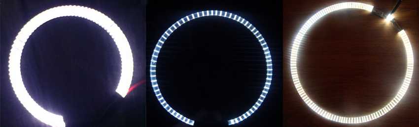 SMD (Surface-mount LED). В таком варианте светодиоды установлены по кругу, на круглую плату. Они обеспечивают очень высокую светоотдачу. Есть много стилей подобных колец, в зависимости от количества и размера светодиодов. Светодиоды SMD смонтированы по окружности и создают свечение отдельными точками. Многим нравится именно такой вид, а кто-то хочет, чтобы светящиеся кольца были более однородные, сплошные. Для этого используется рассеивающий кожух, который помещается поверх светодиодного кольца. Однако это создаёт дополнительное накопление тепла, которое снижает срок службы светодиодов.