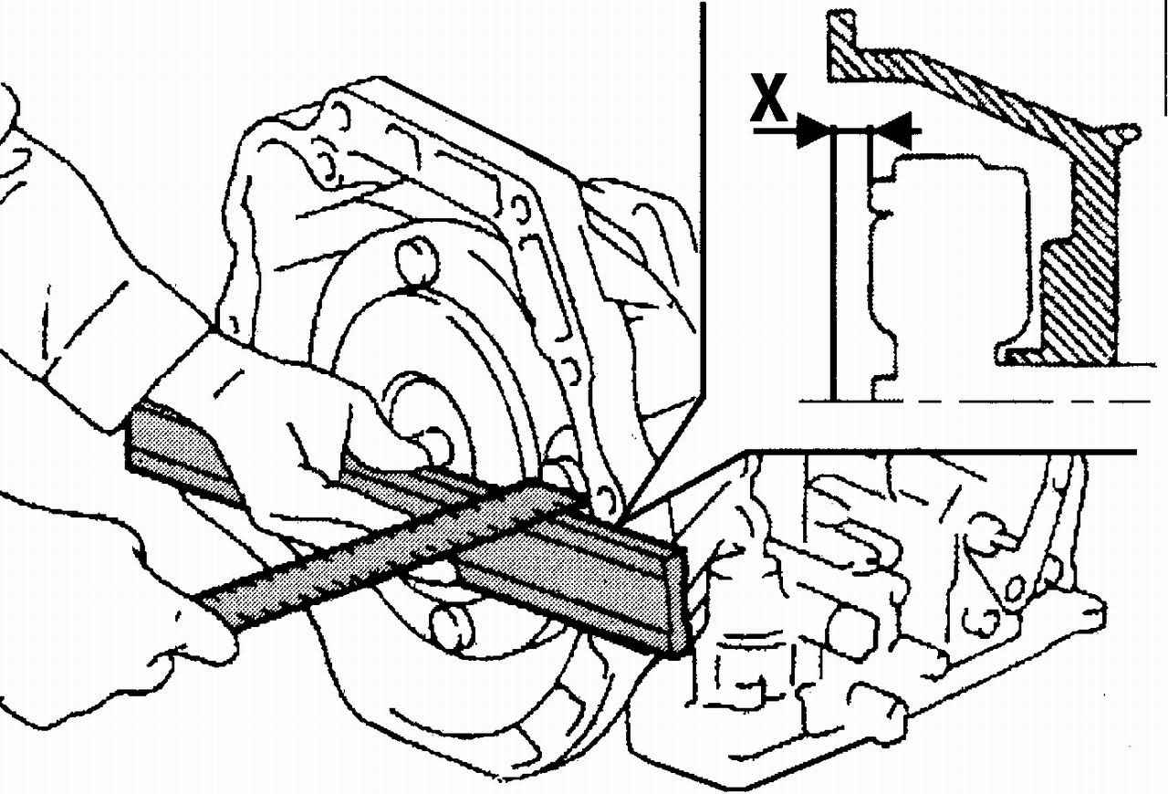 Рис. 4.53. Проверка расстояния между креплением гидротрансформатора и поверхностью сопряжения картера автоматической коробки передач с двигателем: Х — должно быть не менее 21,1 м |