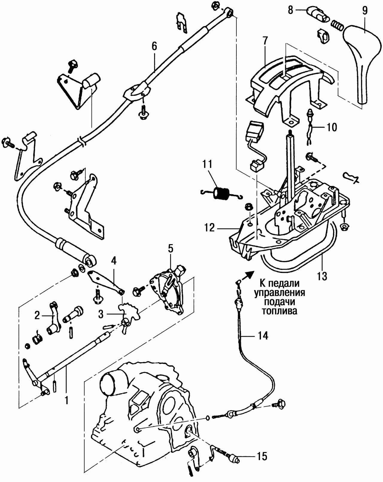 Рис. 4.46. Детали механизма переключения передач: 1 — тяга селектора коробки передач; 2 — рычаг принудительного обратного переключения передач; 3 — кулачок селектора; 4 — пластинчатая пружина редукционного клапана; 5 — выключатель блокировочного устройства стартера; 6 — трос селектора; 7 — сектор рычага селектора; 8 — кнопка блокировки; 9 — рукоятка рычага селектора; 10 — контрольная лампа включения передачи; 11 — пружина; 12 — кронштейн; 13 — прокладка; 14 — трос принудительного обратного переключения передач; 15 — тяга привода положения «Р» рычага селектора |