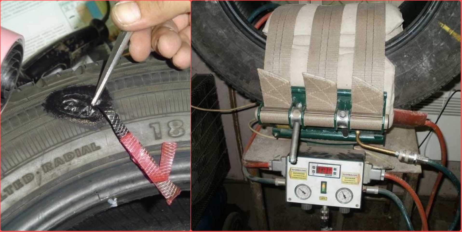 Еще один вариант ремонта – стянуть «грыжу» капроновыми нитями (по периметру повреждения) с последующей напайкой резинового слоя внутри и снаружи путем вулканизации. Результат таких действий не отличается от наклейки заплатки с армирующим слоем. В месте стяжки хоть и удается визуально устранить дефект и несколько повысить прочность, но всего этого – недостаточно, чтобы считать шину допустимой к длительной эксплуатации.