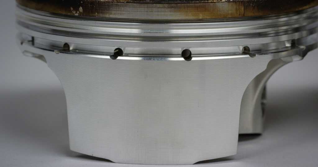 Другой уникальный конструктивный элемент, встречающийся у поршней, предназначенных для тюнинговых моторов, заключается в мини-оребрении площади жарового пояса и на перемычке первого и второго колец. Если поршень становится слишком горячим, то вершина выпуклостей такого оребрения, контактируют со стенкой цилиндра. Этот мгновенный контакт помогает охладить поршень, чтобы уменьшить опасность детонации и разрушения поршня.