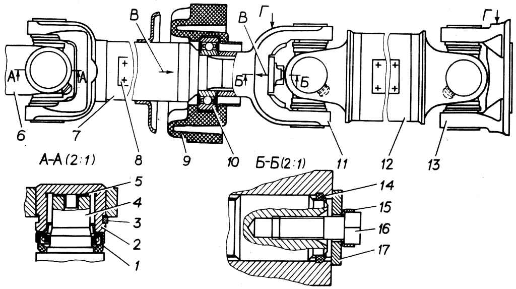 | Рис. 5.28. Карданная передача с промежуточной опорой: Г — место допустимых ударов при сборке; 1 — манжета; 2 — игольчатый подшипник; 3 — стопорное кольцо; 4 — крестовина; 5 — торцевая шайба; 6 — скользящая вилка; 7 — масленка; 8 — балансировочная пластина; 9 — подушка опоры; 10 — подшипник промежуточной опоры; 11 — шлицевая вилка; 12 — задний карданный вал; 13 — фланцевая вилка; 14 — кольцо уплотнительное; 15 — стопорная пластина; 16 — болт; 17 — шайба |