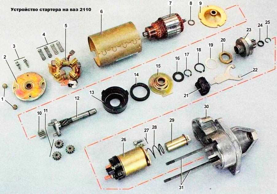 Устройство стартера ВАЗ 2110: 1 — гайки крепления задней крышки; 2 — задняя крышка; 3 — винты крепления щеточного узла; 4 — пружины щеток; 5 — щеточный узел; 6 — статор (с магнитами); 7 — якорь; 8 — упорная шайба; 9 — опора вала якоря; 10 — центральная шестерня редуктора; 11 — планетарные (сателлитные) шестерни редуктора; 12 — вал привода; 13 — внешняя шестерня редуктора с внутренними зубьями; 14 — уплотнительное кольцо; 15 — опора вала привода; 16 — упорная шайба; 17 — стопорное кольцо вала привода; 18 — стопорное кольцо муфты рычага привода; 19 — шайба; 20 — муфта рычага привода; 21 — опора рычага привода; 22 — рычаг привода; 23 — привод; 24 — кольцо ограничения хода привода; 25 — запорное кольцо ограничителя; 26 — тяговое реле стартера; 27 — винты крепления тягового реле; 28 — возвратная пружина; 29 — сердечник тягового реле; 30 — передняя крышка; 31 — стяжные шпильки.