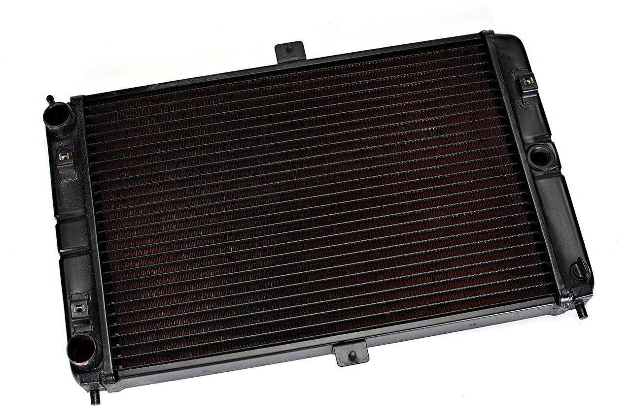 - Медный. Он тяжелее, значительно эффективнее по своим охлаждающим характеристикам, дольше служит, поскольку медный корпус менее расположен к коррозии. Чтобы он потек, требуется чаще всего механическое воздействие (удар и т.п.). Недостаток – цена его выше, около 5000 рублей, за двухрядный, с повышенным на 40% КПД. Медный радиатор охлаждения с увеличенным на 40% КПД