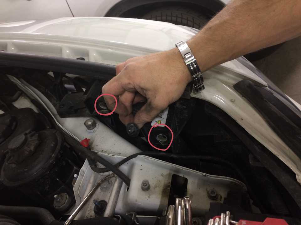 Основной смысл заключается в том, чтобы снять кронштейн фары, после этого можно спокойно снимать саму фару.Кронштейн фары крепится на трёх болтах, два сверху под капотом и один снизу под подкрылком.Два сверху очень легко отворачиваются.