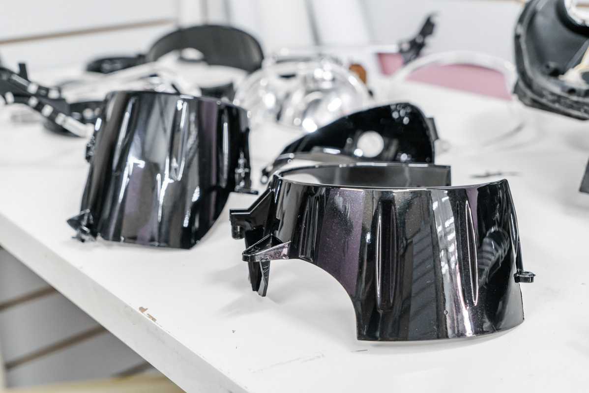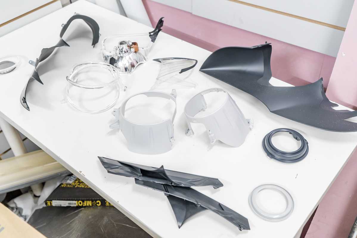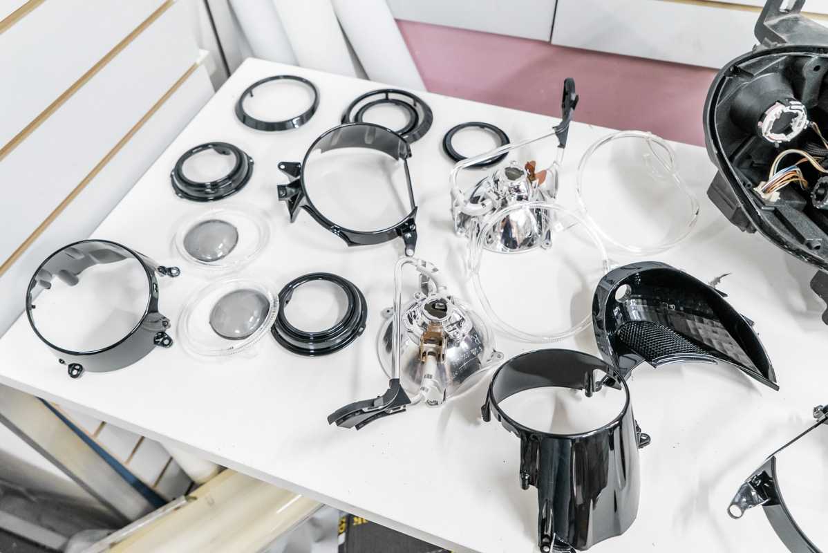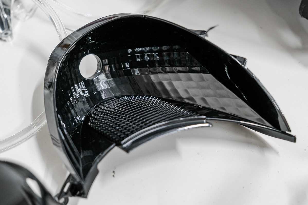 Демонстрация элементов фар после покраски в черный глянец.
