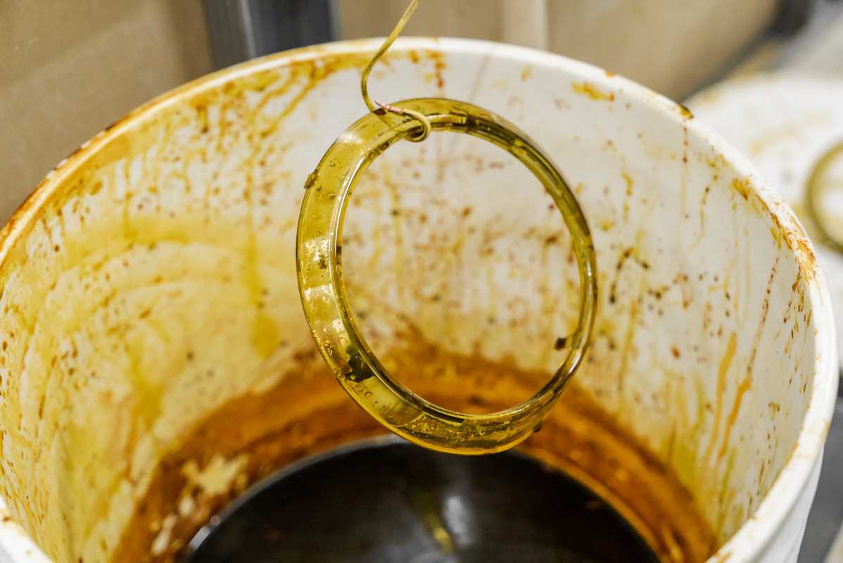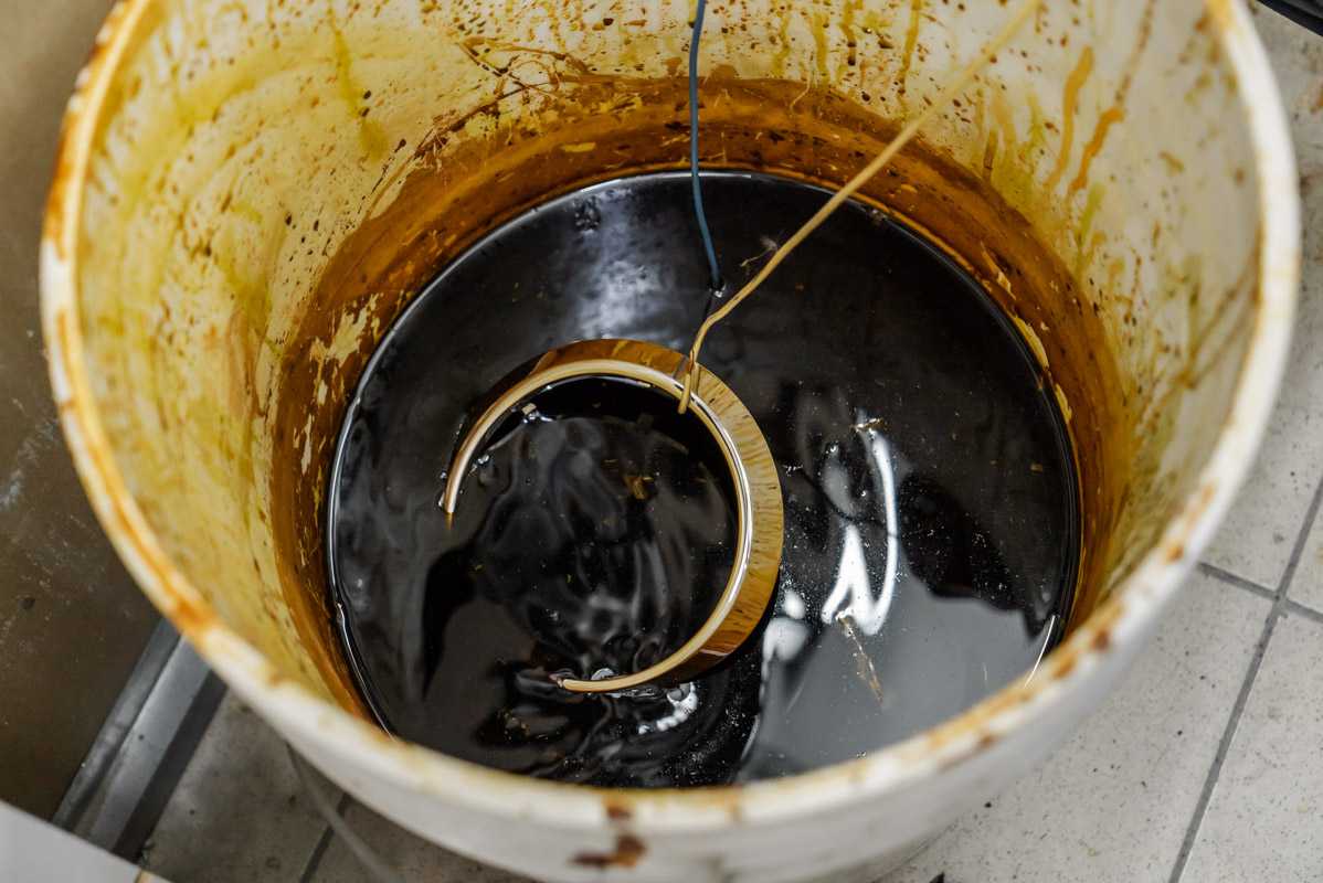Спилив стекла с фар БМВ Х5 Е70 для замены линз, мы снимаем старую оптику и все остальные элементы фар – перед покраской следует удалить весь хром ; работаем с хлорным железом, окуная детали в раствор, где сразу после извлечения хромированное покрытие начинает облезать и его легко счистить вручную.