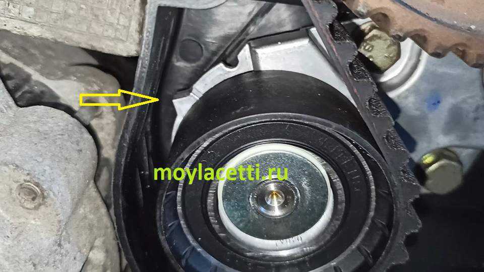 - При установке нового натяжителя необходимо следить, чтобы паз на двигателе совпал с выступом на ролике.