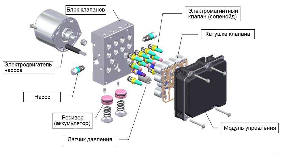 Исполнительный механизм (его еще называют гидроблоком или модулем ABS) – самый сложный по конструкции и состоит из ряда элементов: