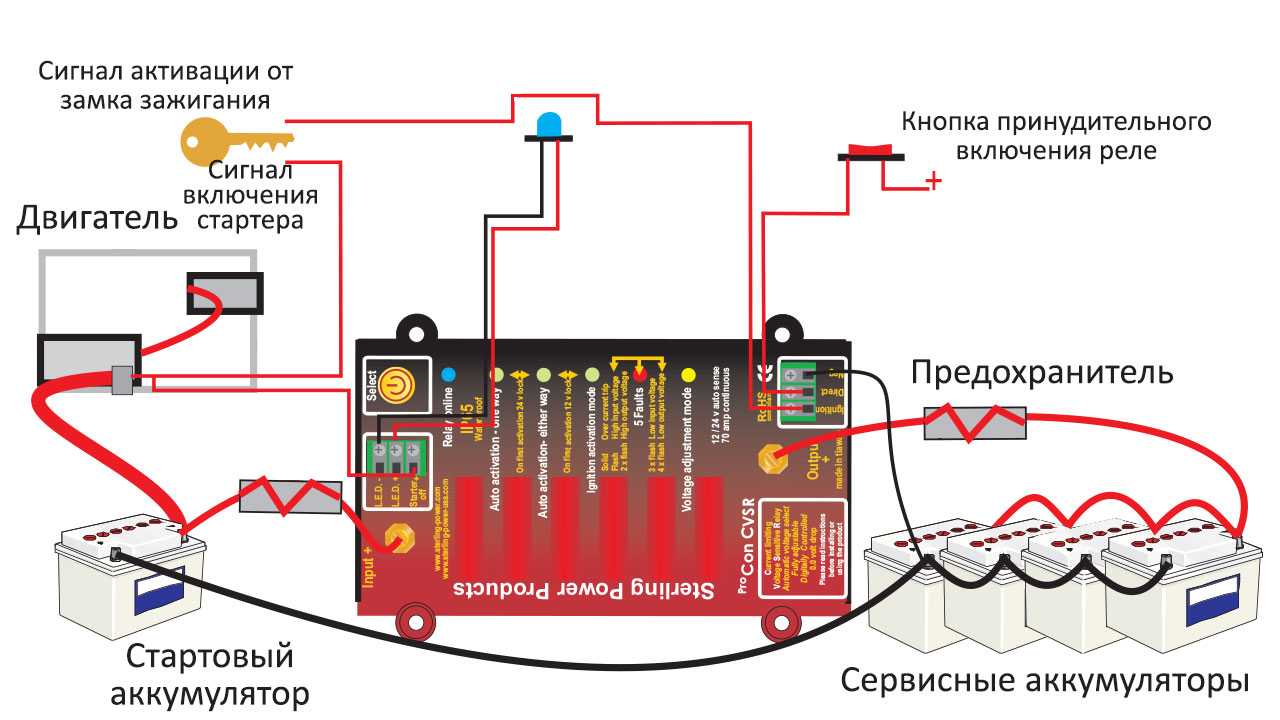 Схема подключения реле развязки. Для защиты дорогой электроники от скачков напряжения, возникающих при запуске двигателя, реле соединяют с соленоидом стартера. Как только на нем появляется напряжение, реле разъединяет аккумуляторы