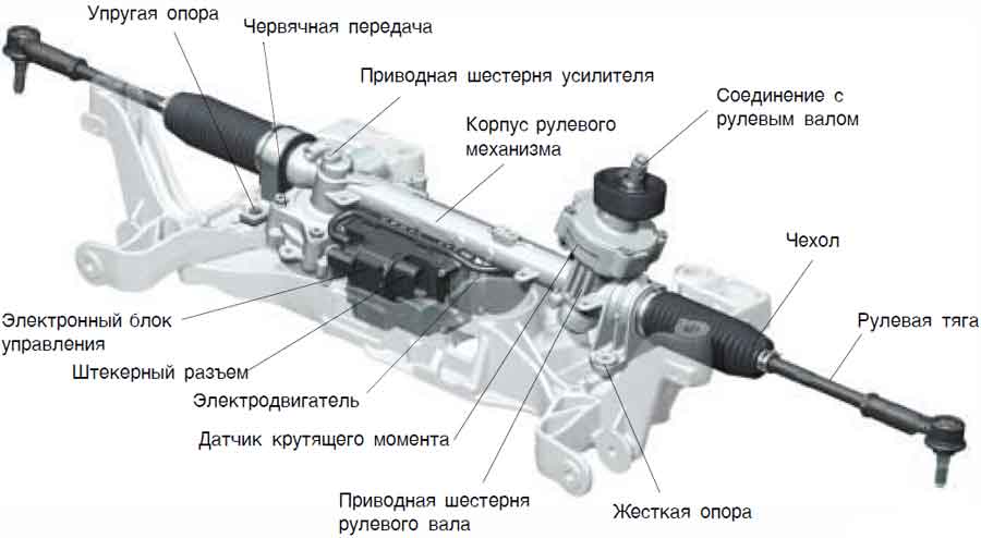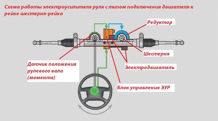 В этом случае электроусилитель находится на рулевой рейке, перпендикулярно ей. Это частный случай такого расположения. В большинстве автомобилях ЭУР устанавливается параллельно – это экономит место под капотом.