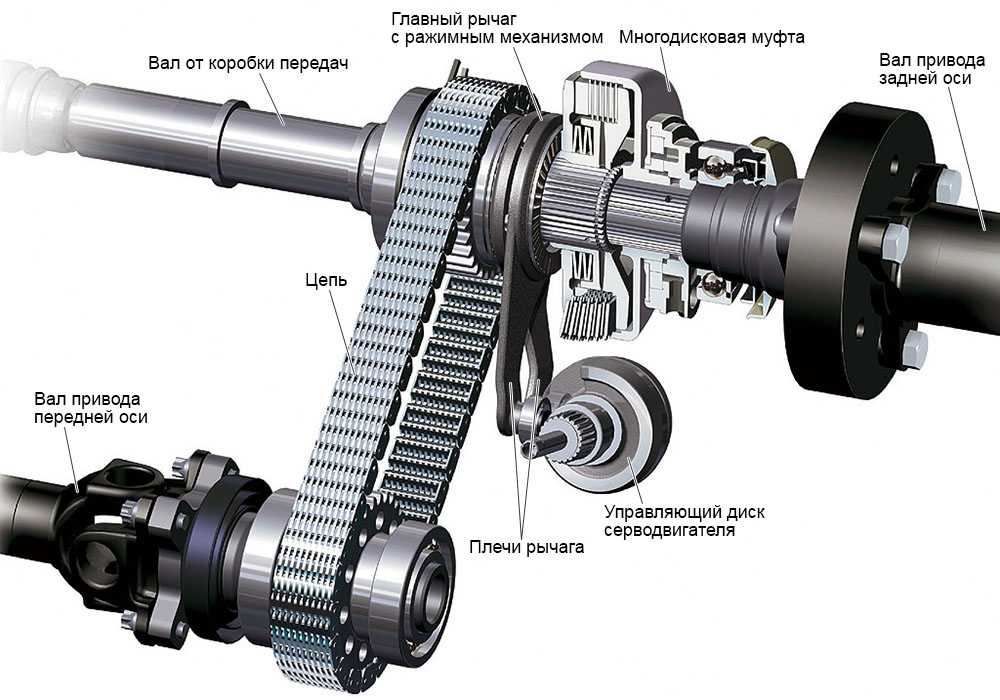 Вращение постоянно подается на задний мост, то есть авто с таким приводом в действительности является заднеприводным. При этом сервопривод за счет системы рычагов поджимает фрикционные диски межосевой муфты, что позволяет отбирать мощность и подавать ее на вал привода передней оси.