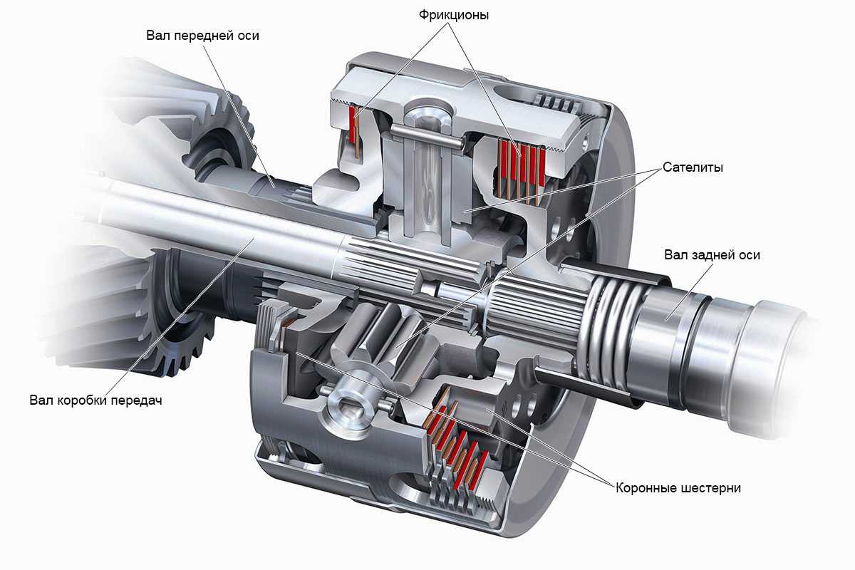 На заднюю ось крутящий момент попадает по карданной передаче. Конструктивно она выполнена из двух валов, промежуточной опоры и трёх шарниров равных угловых скоростей. Упирается кардан в задний мост, где, как правило, в отельном корпусе находится главная передача и ещё один межколёсный дифференциал. Он, кстати, может быть свободным с механической или электронной блокировкой, а бывает и с самоблокирующимся Torsen.