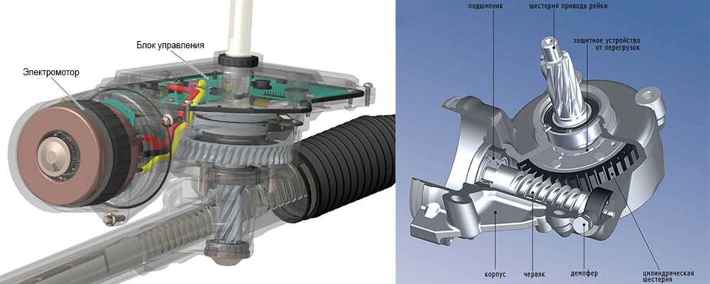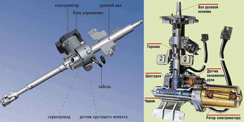Что касается усилителей, устанавливаемых на рулевой механизм, то у этих типов конструкция раздельная – датчики установлены на колонке, блок управления располагается где-то в салоне, а двигатель с редуктором расположен на рулевом механизме.