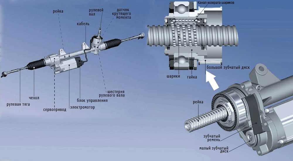 Принцип работы электроусилителя руля этого типа сводится к тому, что усилие, создаваемое электродвигателем, передается на гайку, установленную на рейку (посредством ременной передачи) или же напрямую, когда электромотор встроен в рулевую рейку. В результате гайка начинает вращаться, при этом она из-за конструкции корпуса не может смещаться в продольном направлении. Поэтому вращение гайки приводит к перемещению самой рейки, тем самым и создается дополнительное усилие на рулевом механизме.